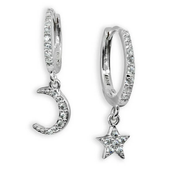 Small, simple & chic! Make a celestial statement with these Cubic Zirconia Moon & Star Charm dangle drop huggie hoop earrings.