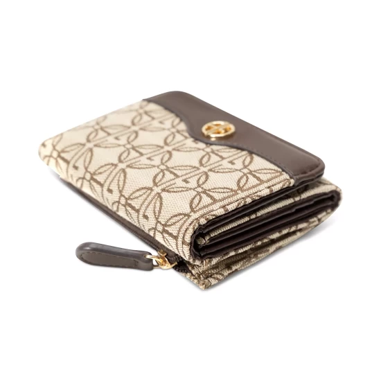 Rich logo jacquard details Giani Bernini’s palm-sized wallet, featuring ample card slots and pockets for financials in a compact, trifold design.